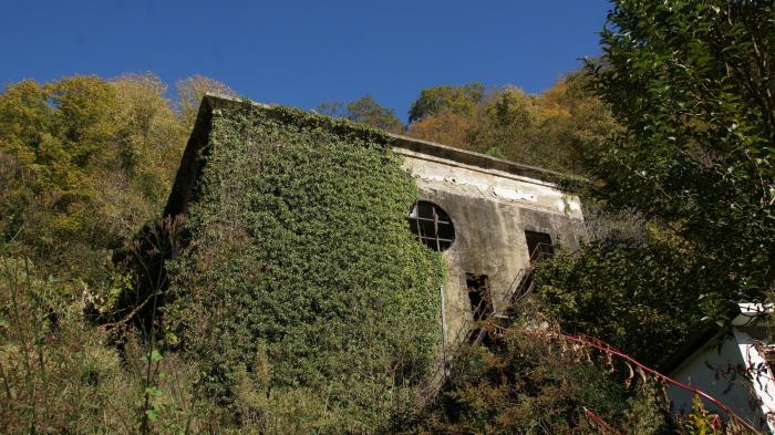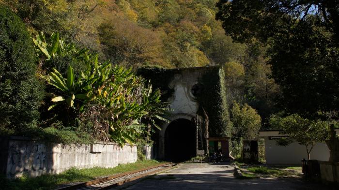 И далее до железнодорожной станции с оригинальным зданием вокзала и железнодорожными путями, уходящими в обе стороны в тоннели: