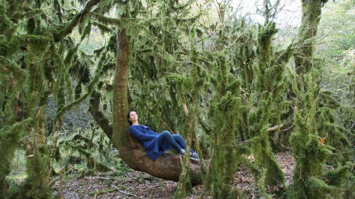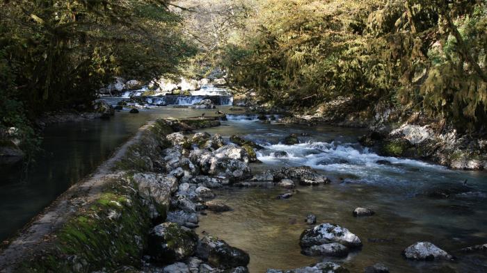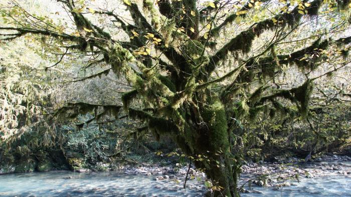 На берегах заросли самшита и кизила, деревья облеплены мхом, свисающим пышными гроздьями: