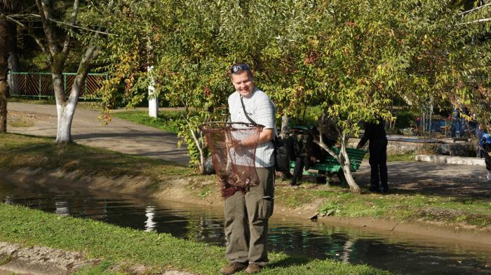 Оказалось, что это не такое уж и простое занятие — ловить рыбку сачком. Она невероятно быстрая, поэтому гоняться за конкретной рыбиной занятие бесперспективное. Нужно резко опустить сачок в гущу косяка и тогда есть шанс, что какая-нибудь рыбешка сама запутается в сетке. Главное условие — резкость. У нас в сачке оказались сразу две рыбки :)