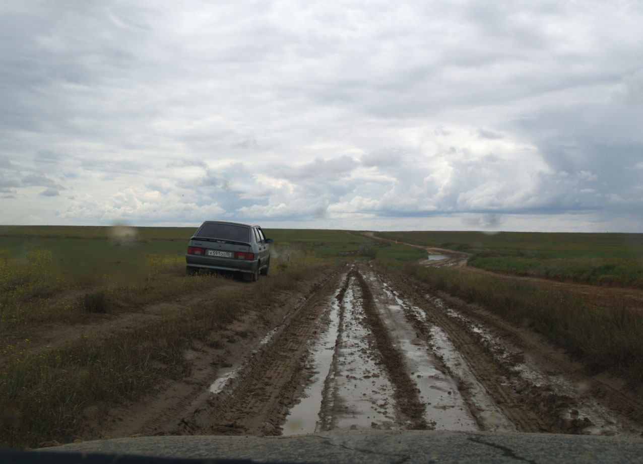 Через пару километров снова садится. Опять дергаю. Пробираемся дальше. В общем, выручаю его три раза. В результате, на двадцать километров пути трачу больше двух часов. Когда добираемся до асфальта, мой попутчик благодарит и уверяет, что заставит молиться обо мне всех своих домочадцев. Ну-у-у! Эта помощь не стоит так дорого. Просто жму его руку, обмениваемся телефонами, и прошу сфотографировать меня и машину на фоне калмыцкой степи.