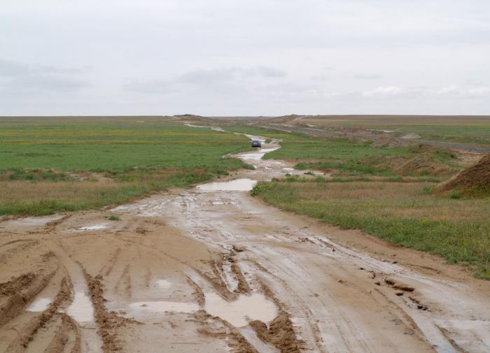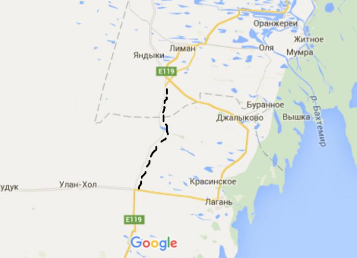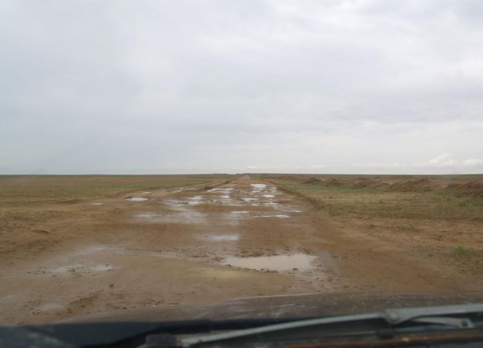 Ан, не тут-то было! Навигатор «решает» меня осчастливить сокращением пути на полсотни километров, и вместо того, чтобы заранее направить в объезд по асфальту, предлагает ехать напрямую по степи короткой дорогой (пунктирная линия).