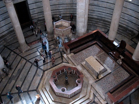 Лишенный особых украшений в своем внутреннем убранстве, баптистерий обладает исключительной акустикой и является самым большим в Италии – в окружности его длина составляет 107,24 м.