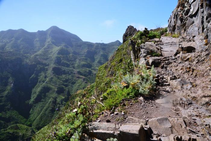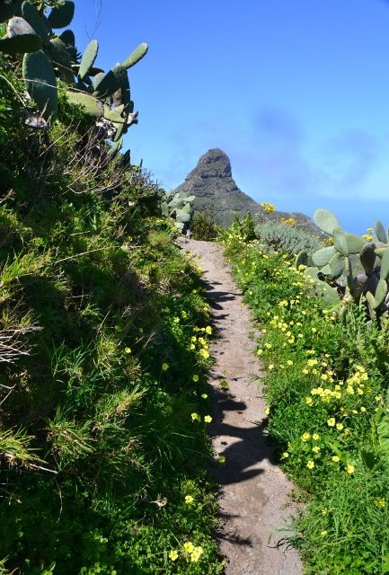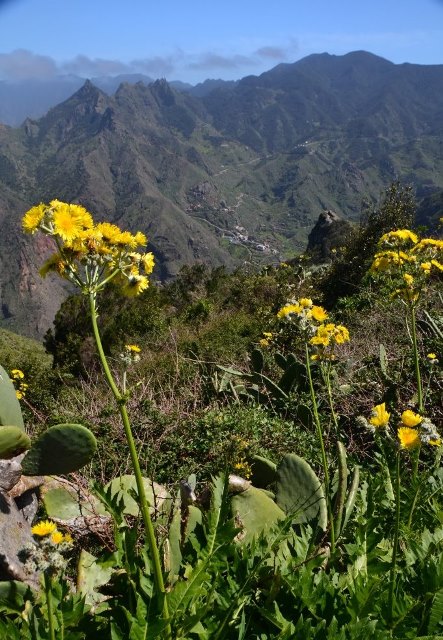 На одном из ответвлений тропы – весьма условном – пришлось продираться сквозь заросли, да еще по соседству с устрашающими кактусами. Зато наградой был вид на долину: за горной грядой лежит Таганана, через которую мы проезжаем, направляясь в Бенихо.