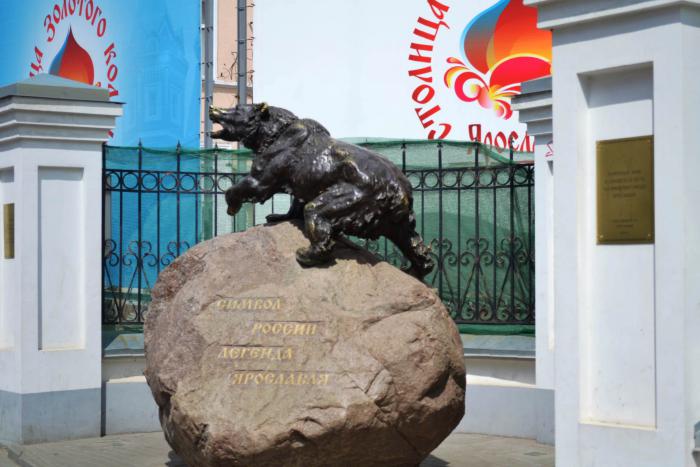 Только вышли из машины – откуда-то донеслись странные звуки. Оказалось, это подал голос памятник символу Ярославля – изображения медведя здесь встречаются повсеместно.