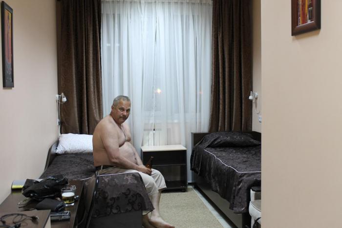 Полюбовавшись величественной панорамой Байкала с высокого берега Слюдянки мы отправились покорять известный байкальский «стритрейсинговый» участок дороги на Иркутск. Несколько часов спуска с перевала по довольно узкому серпантину изрядно вымотали весь наш экипаж. В Иркутск мы буквально ввалились, мечтая об отдыхе, но увы… Парковка в отеле оказалась занята и мы долго кружили по улицам в старом центре в поисках платной парковки недалеко от отеля, так что даже работники ГИБДД, скучающие на посту на небольшой улочке, заинтересовались огромным красным «танком», который 4 раза проехал мимо них в разных направлениях. Эти ребята и посоветовали нам место для ночлега. В отеле, по моему «Россия» было дорого, но мы падали с ног, вернее с колес, и, наплевав на все, взяли номер на ночь, посидели в баре, перевели дух и хорошо выспались.