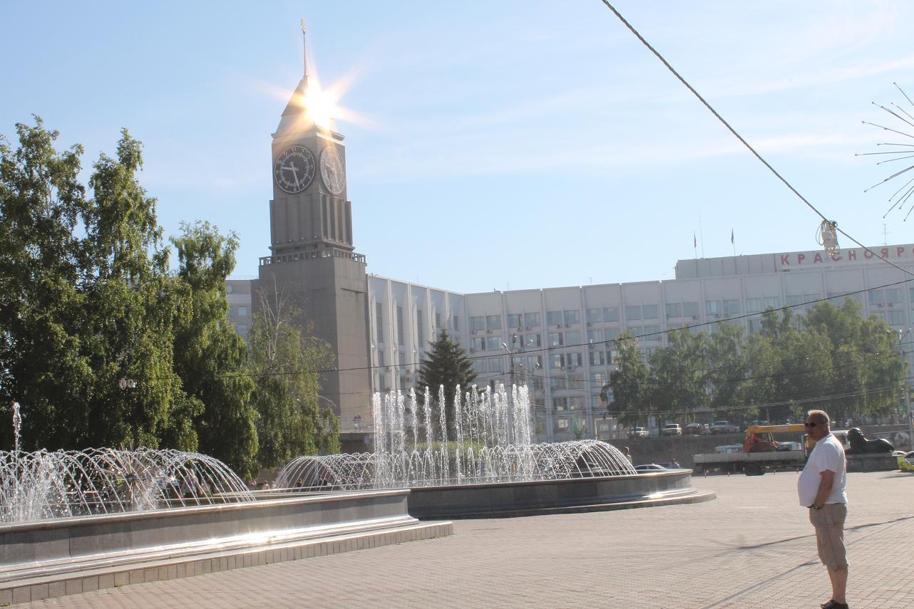Площадь около театра оказалась зоной бесплатного wi-fi и мы заказали на вечер гостиницу в Новосибирске. Потом погуляли по театральной площади, полюбовались фонтанами, Енисеем, купили мороженое и довольные собой отправились дальше.