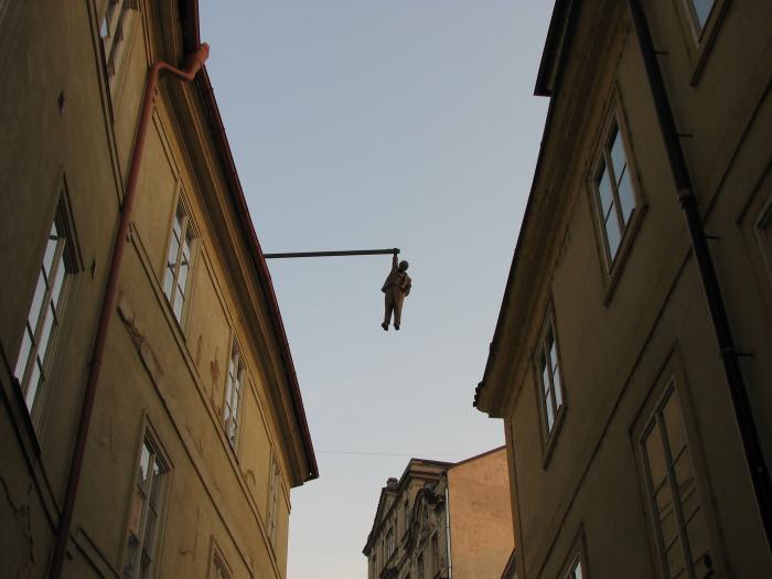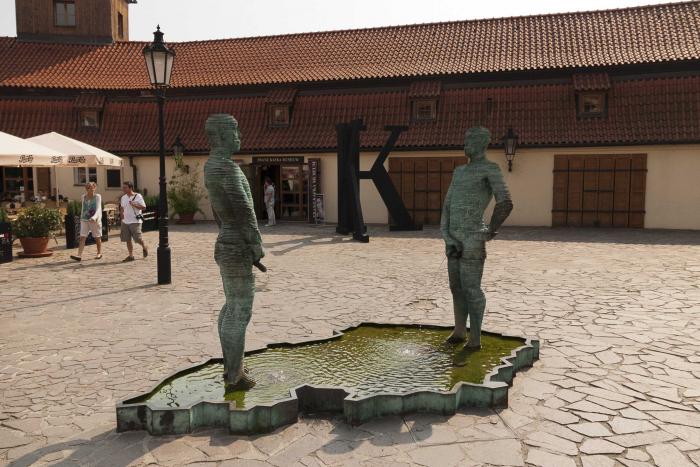 Во дворе музея Франца Кафки, с целью привлечения внимания туристов к выставке, размещен фонтан «Писающие мужчины». Фонтан «Писающие мужчины» был разработан чешским скульптором Дэвидом Черным. Благодаря современным компьютерным технологиям, статуи не только могут справлять нужду на карту Чехии, но и могут создавать надписи у подножия. Каждый из посетителей может «заказать надпись», отправив желаемый текст в СМС на специальный номер.