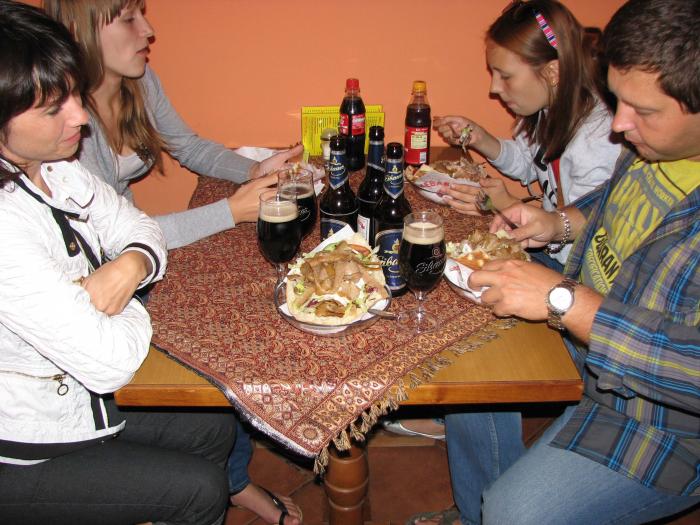Заказали по «супер-кебабу», т.к. были очень голодны, пиво и напитки деткам. Интересно они там нарезают мясо, не срезают ножом, а бреют специальным устройством. Получаются такие мясные ленточки. Ох, и зря же мы с голодухи выбрали «супер» — они оказались супер-вкусыми и супер- огромными, во вкуснейшей хлебной лепешке! Чуть не лопнули, но съели все до конца. «Doner Kebab» — это сеть быстрого питания, хорошая домашняя булка без мякиша наполненная мясом-гриль и всевозможными овощами. Стоит это удовольствие 2-3 евро. Причем порция громадная, можно смело брать один на двоих.