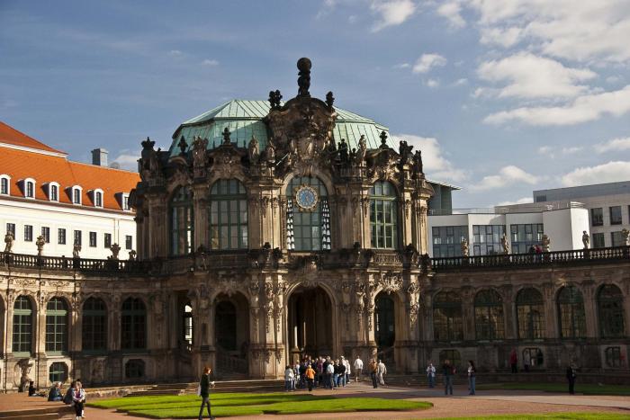 Каждые 15 минут во дворе Цвингера раздается нежная мелодия — это бьют часы с фарфоровыми колокольчиками на Городском павильоне.