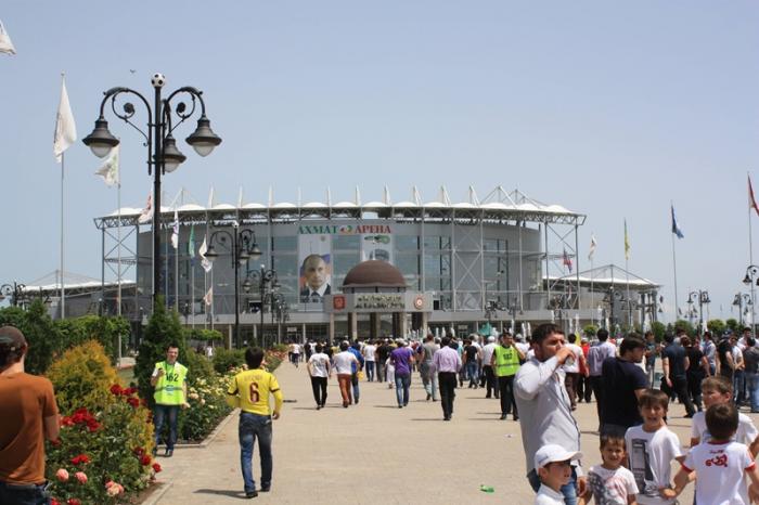 На стоянку стадиона пропускают только машины с дагестанскими номерами. Таких как мы нет вовсе, поэтому нас тоже пропускают. Чеченские машины не пускают. Им предлагают парковаться вдали от стадиона. Оказывается было указание Рамзана о том, что гости Республики, прибывшие на матч, могут беспрепятственно передвигаться по территории Чечни. Припарковав машину, идём к стадиону. Вокруг праздничное настроение, все предвкушают победу соей любимой команды: они своей – мы своей.