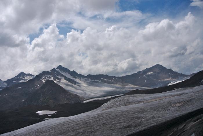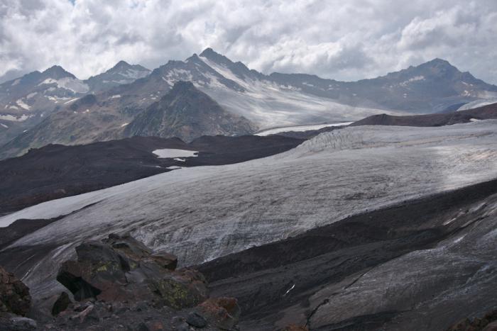 Отсюда хорошо видно, насколько Эльбрус доминирует над окружающими горами. С отметки 3500 метров мы смотрим на них почти сверху вниз.