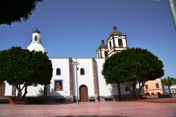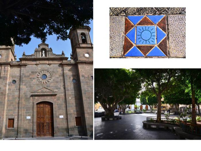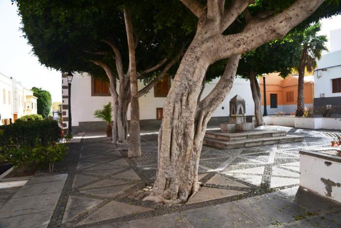 Церковь Сан-Себастьян – центр Агюимеса. По сложившейся испанской традиции, на двери навешен большой амбарный замок. А вот тенистая площадь по соседству многолюдна и манит прохладой.