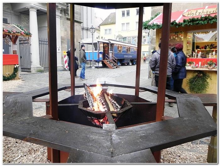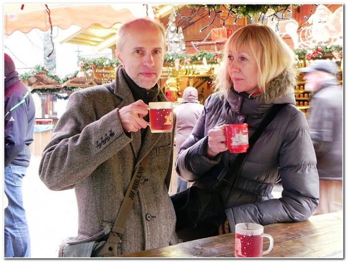 Потом отведали местных колбасок – самое традиционное и самое демократичное блюдо на Рождественском базаре. Есть и пить здесь очень удобно, пристроившись у прилавка, в который вмонтирована специальная чаша с открытым огнём.