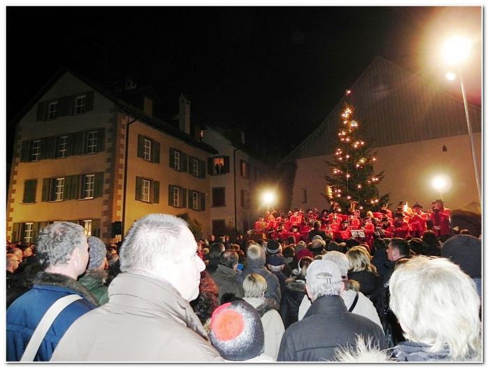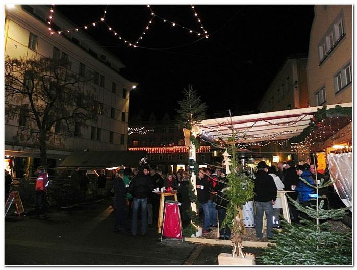 Представление закончилось, но народ расходиться не торопился. Мы тоже немного покрутились в толпе, поразглядывали публику, которая явно относилась к крепкому среднему классу, после чего отправились на поиски Рождественского базара. Нашли его в довольно неожиданном месте – у стен символа Брегенца башни Мартинстурм.