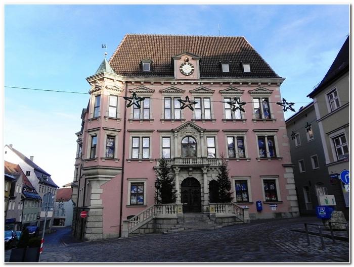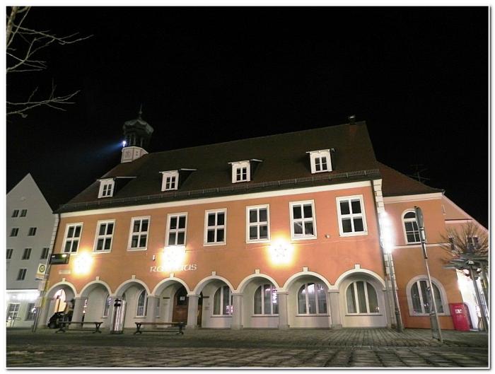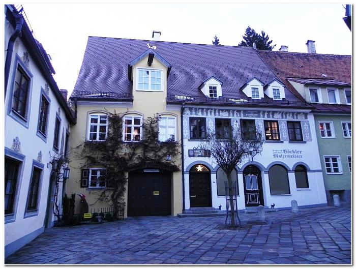 Здание знаменито не архитектурными изысками, а небольшой скульптурной группой на углу фасада, которая является старейшей скульптурой Кауфбойрена. Неожиданно.