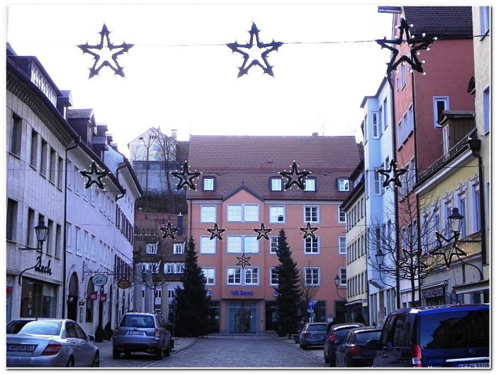Улица в Кауфбойрене, по которой вы направляетесь к «традиционным точкам притяжения», вроде бы похожа (для нас, дилетантов) на другие такие же улочки в старых европейских городках. Но то ли из-за цветовой гаммы, то ли еще из-за чего — от нее так и веет зимним стылым воздухом. Это классно! Стужа — куда лучше, чем слякоть. =)