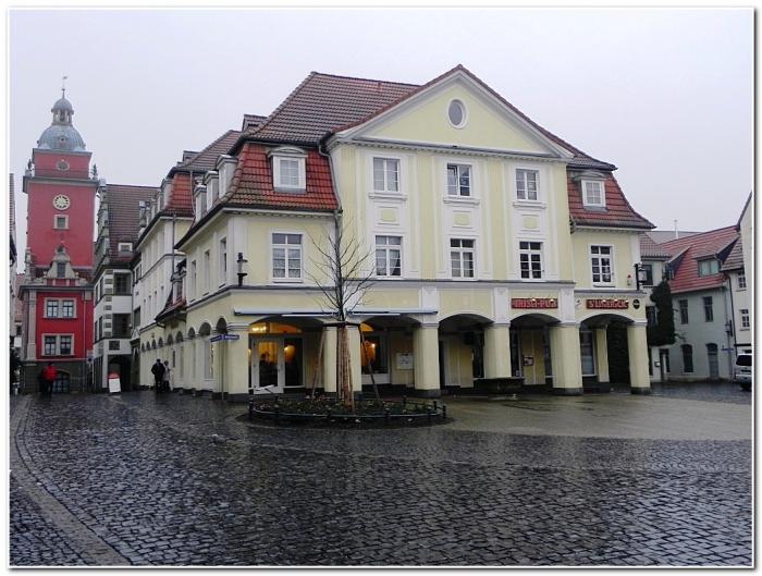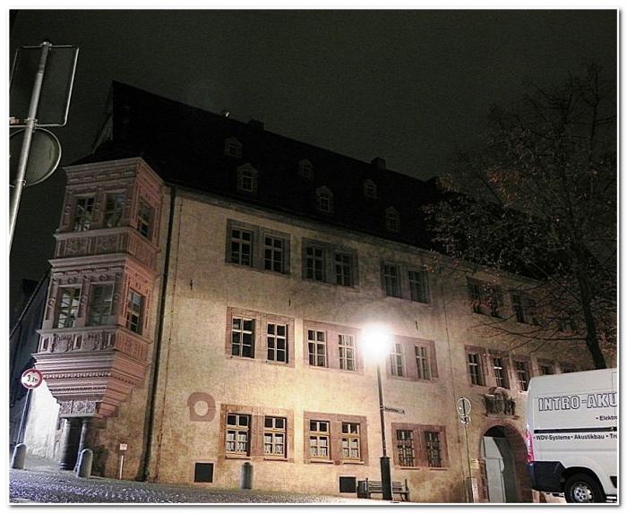 В дальнем углу Рынка мы обнаружили Новый дворец – бывшую резиденцию местечкового герцога. Это здание довольно сложно было бы выделить среди прочих домов Зангерхаузена, если бы не габариты, что вторично, и, главное, не изумительный угловой двухэтажный эркер. Хотя сейчас, чуть ли не касаясь тротуара на вросшем по колено в землю замке, смотрится он несколько нелепо.