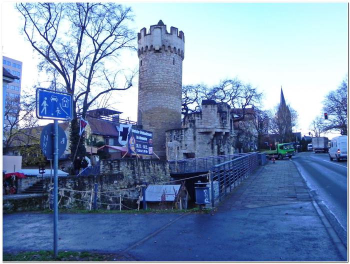 Весь этот живописный ряд довольно естественно упирается во фрагмент исторической городской стены, края которой увенчаны воротами с надвратной башней Johannistor и просто башней Pulverturm.