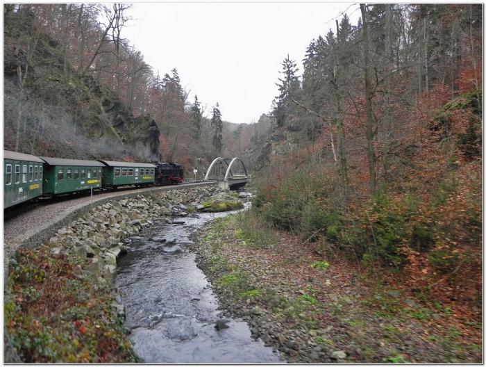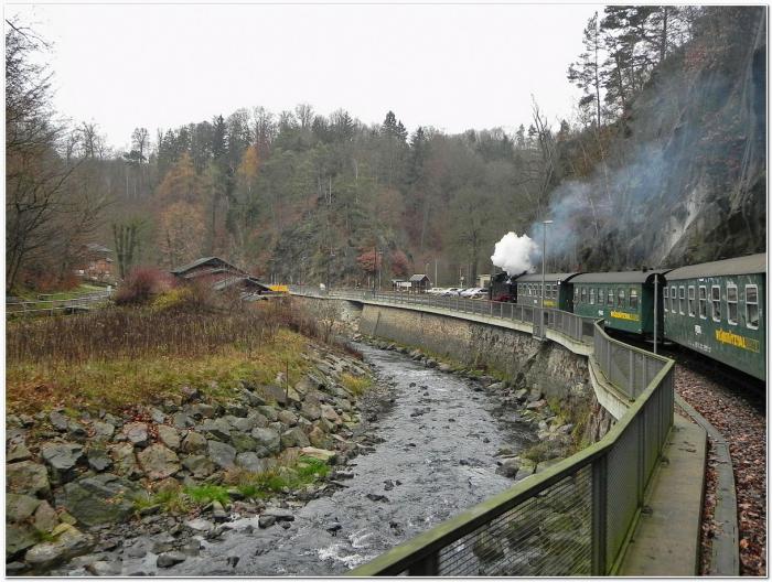 Видимо, имеет смысл дать краткую характеристику Weißeritztalbahn. Колея — 750 мм; протяжённость — 26,3 км; перепад высот — 350 м; максимальный градиент — 1:40; 13 станций и остановочных пунктов; 34(!) моста.