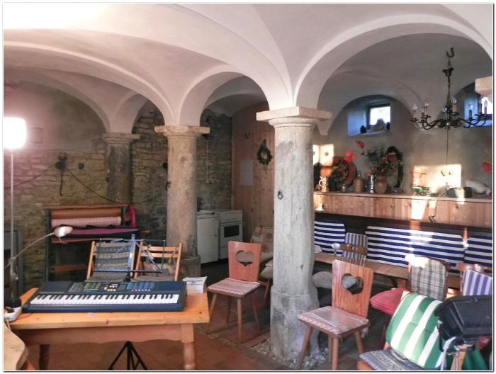 Наверх к туристкам, естественно, не пустил, но сопроводил в цокольный этаж, где у него обустроена музыкальная студия.