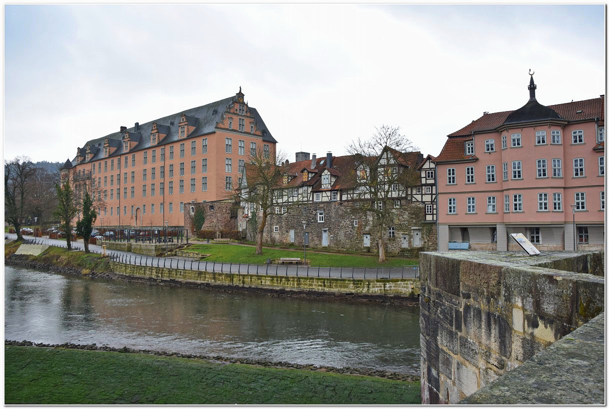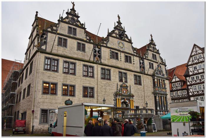 На этот раз идём на прогулку полным составом, хотя погода мерзкая. Изучать Ханн. Мюнден я решил шиворот навыворот, т.е. начать с Рыночной площади, дабы в случае резкого ухудшения погоды можно было безболезненно свернуться. Поэтому в центр летим без оглядки, хотя объектов, на которых можно задержать взгляд, здесь в избытке. Ратуша в Ханн. Мюнден чумовая – ярчайший образец везерского ренессанса.