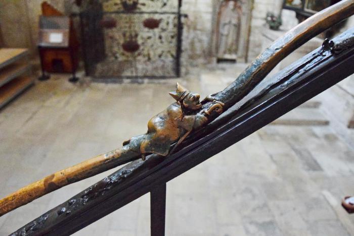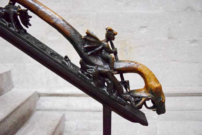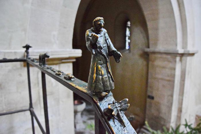 Лестничные перила, ведущие в клирос, созданы во времена ГДР. На южной стороне изображена процессия животных к проповедующему св. Франциску.
