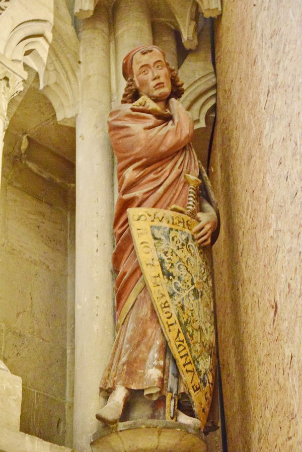 Особенно наглядно это проявилось в фигурах учредителей собора, выполненных в человеческий рост и установленных в западных хорах храма на высоте четырёх метров, то есть на одном уровне с изображениями святых на витражах.