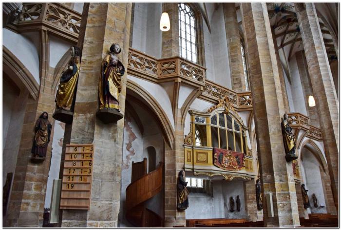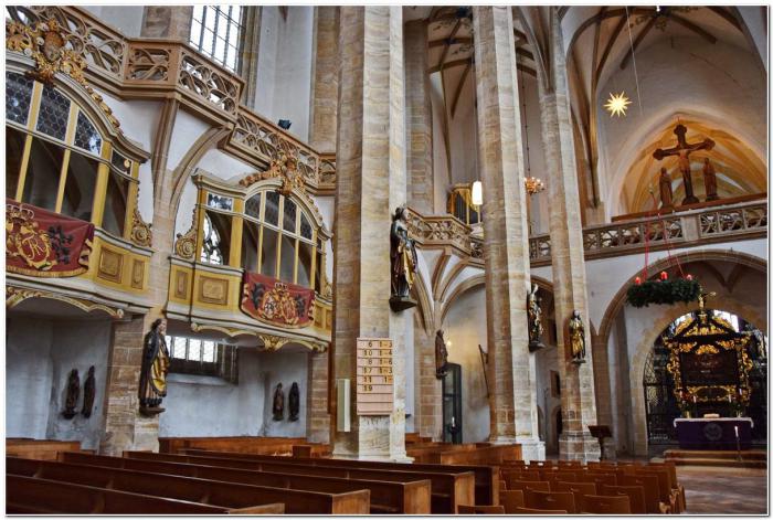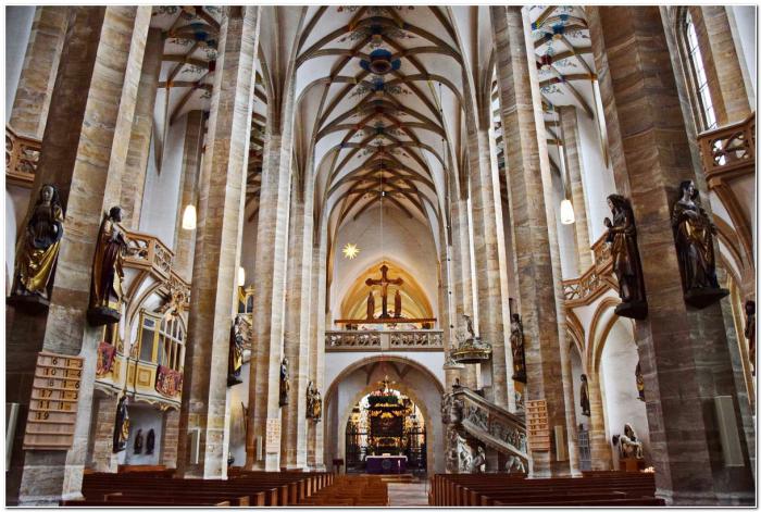 Покупаем билеты, «выбиваем» краткие русскоязычные путеводители и идём в музей. По-другому назвать этот храм язык не поворачивается. Построен он по принципу зальной церкви, но, в отличие от Анненкирхе из Аннаберг-Буххольца, в глаза это не бросается. Всему виной кажущийся бесконечным строй из вогнутых колонн, разделяющих собор на три нефа.