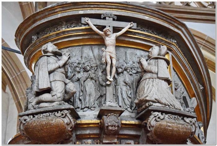 Это подарок бургомистра города, который пожелал быть увековеченным, в том числе будучи изображённым в коленопреклонённой позе под распятием на пару со своей женой.