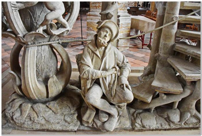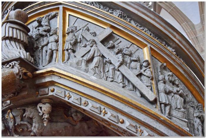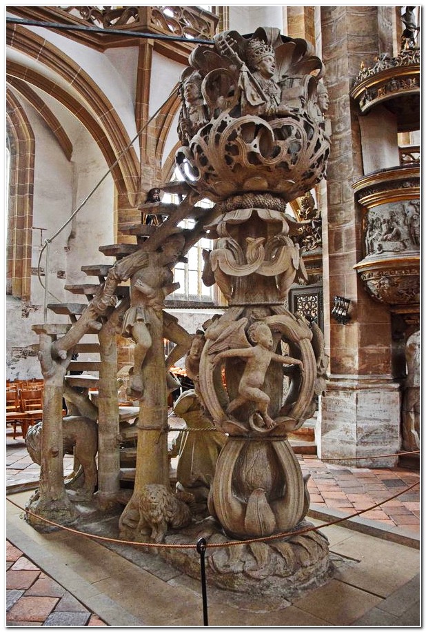 До сей поры, рассказывая о скрытых от посторонних глаз сокровищах фрайбергского собора, я старательно обходил вниманием те из них, которые произвели на меня наиболее мощное впечатление. Речь идёт о кафедрах, которых в храме аж две. Кафедра в форме тюльпана создана в 1510 году. Она представляет собой филигранную резьбу по камню.