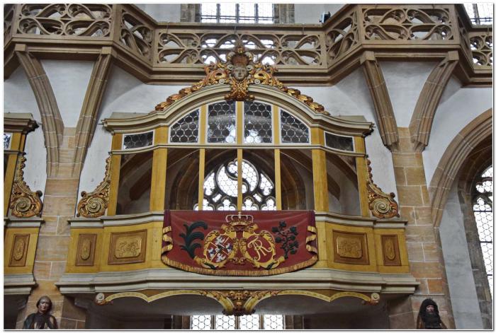 В двух нишах в глаза бросаются ложи семьи курфюрста. Напоминают они подвешенные кареты без колёс.