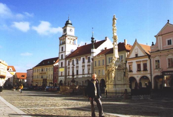 Тршебонь (Třeboň). Машин по-прежнему немного. Дорога идёт среди старинных прудов для разведения рыбы, которые до сих пор, наверняка, являются существенной статьёй местного дохода. В 12.10, насквозь преодолев по узким улочкам миниатюрный Старый город, нашли большую бесплатную парковку метрах в 200-300 от Градецких крепостных ворот. Идём гулять. Сразу же оказываемся на главной Масариковой площади. Длинная и очень узкая, почти как улица, площадь окружена ренессансными и барочными домами, некоторые из них с нашими любимыми аркадами. На площади доминируют ратуша с 30-ти метровой башней, фонтан и Марианская колонна.