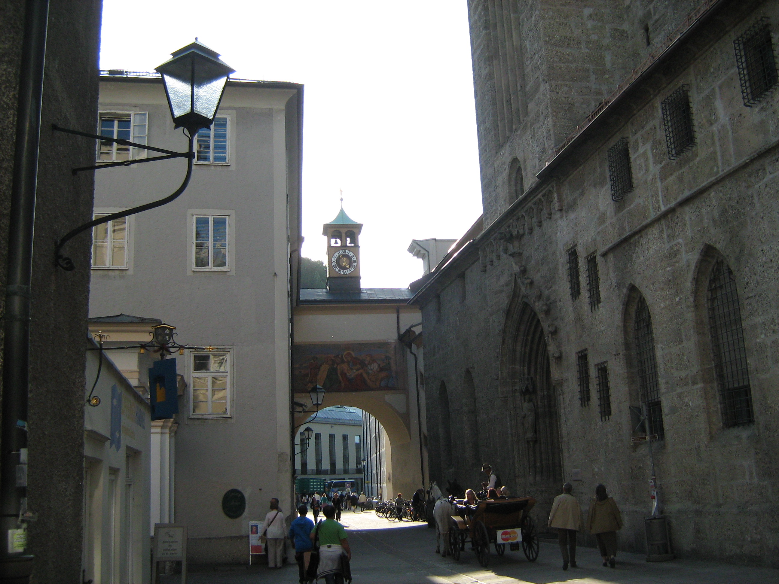 С моста Макарт выходим на набережную Франца-Иосифа, которая перетекает в Грисгассе. Поворачивает в арку направо и вот перед нами дом где родился Вольфганг Амадей Моцарт.