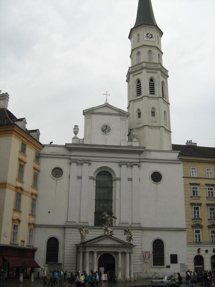 ныне штаб-квартира ОБСЕ. На этой площади есть остановка экскурсионного автобуса работающего по системе «Hop on – hop off» фирмы «Gray Line». Есть аудиогид на русском языке. Автобус ходит по трём маршрутам: красный – по центру города, зелёный везёт в летнюю резиденцию Габсбургов – Шёнбрунн и синий – на основное русло Дуная. Каждая экскурсия длится час. Можно купить билет на час – 13 евро взрослый билет, получается одна экскурсия, можно на два – 16 евро, соответственно можно успеть на две экскурсии, а можно на сутки – 20 евро и можете ездить по любым маршрутам, входить и выходить на определённых остановках бесконечное количество раз. Таким автобусом мы пользовались в Будапеште и нам понравилось. Мы купили билеты на сутки. Время было 16 часов, поэтому купив билет на сутки, фактически у нас было в распоряжении два дня, т.к. он действовал до 16 часов следующего дня. Пересадки с маршрута на маршрут происходят на остановке «Государственная опера». В первый день мы проехали на автобусе по красному маршруту «Центр». Когда садились в автобус лил проливной дождь, а когда, сделав круг, через час вышли в точке отправления на Хелденплатц, светило солнце и от дождевых туч не осталось и следа. Мы продолжили пешую прогулку. Через двор Хофбурга вышли на Михаилерплатц, напротив церковь Св. Михаила,