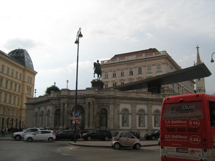 повернули направо на Августинерштрассе. Прошли мимо Альбертины и вышли на Кернтнерштрассе это торговая улица с дорогими магазинами. На пересечении улиц Кернтнерштрассе и Йоганесгассе поворачиваем налево и мы на площади Нойер Маркт, на которой находится церковь Капуцинов