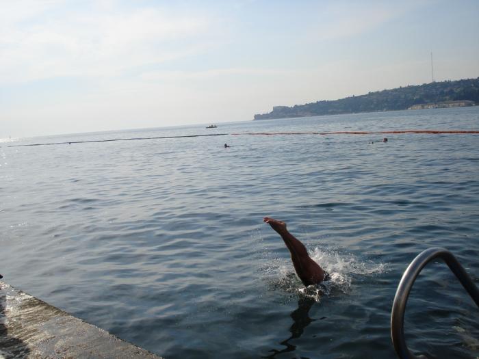 Конечно, главной частью нашего отдыха в Словении было море. Мы купались утором, днем, вечером и ночью. За все 14 дней я ни разу не помню, чтоб у меня были сухие волосы. Вода с каждым днем становилась все теплее. Средняя температура воды в конце июня была 26 градусов. Пляж принадлежал кемпингу, поэтому народу было не много, все свои.