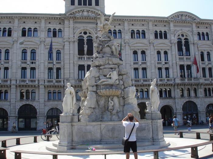 После славного вечера с бесконечным вином, некоторым было тяжеловато. До Италии от кемпинга всего 30 километров. Первый город Италии Триест. Город большой с плотным автомобильным движением. В центре морская набережная. В Триесте по сей день действует единственный в Европе пляж, разделенный на две половины — мужскую и женскую. На фоне моря площадь Единства Италии deir Unitad’Italia – ну чисто венецианская Сан-Марко.