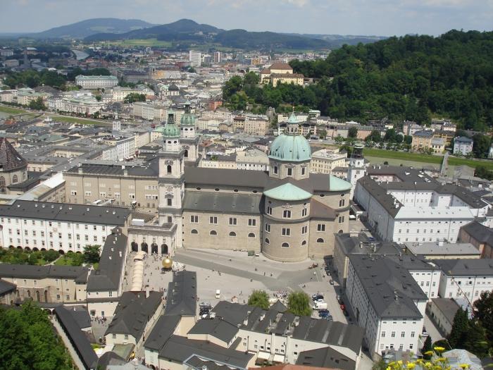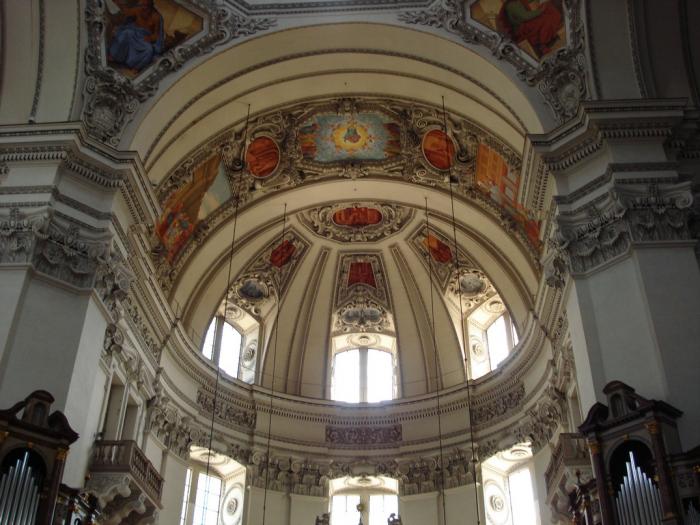 Кафедральный собор Зальцбурга расположенный в том месте, где Резиденцплатц плавно переходит в Домплатц, является всемирно известным храмом, в котором находится орган с 4000 трубами. В соборе так же находится купель, в которой крестили Моцарта. Интерьер оформлен в богатом барочном стиле.