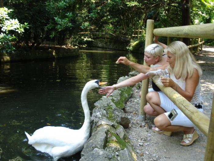 В прудах парка множество рыбы и живет лебедь, старый Оксанин дружок, который ест булочку только из рук.