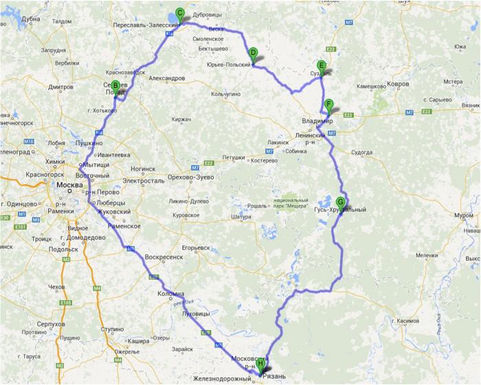 Путь прошел через следующие населенные пункты (по порядку): Рязань, Коломна, Москва, Сергиев Посад, Переславль-Залесский, Юрьев-Польский, Суздаль, Боголюбово, Владимир, Гусь-Хрустальный, Тума, Спас-Клепики, Рязань.