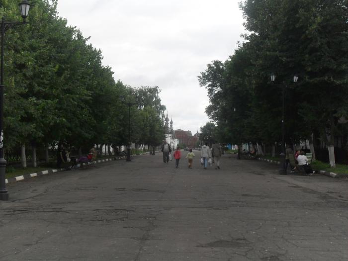 Побродив по центру, мы вышли на пешеходную часть улицы 1 мая — которая представляет собой широкий бульвар, вдоль которого стоят скамейки и уличные фонари. По бульвару гуляет молодежь, семейные пары. Улица проходит между старинных торговых рядов и выходит к Михайло-Архангельскому монастырю, который окружают не только стены, но и крепостной вал, сооруженный при основании города. Правда, как и в Рязани, крепостной вал не смог спасти город от войск Батыя. Вообще интересно видеть хорошо сохранившийся крепостной вал, внутри которого стоят жилые и административные здания (кроме Юрьева-Польского, такую картину мы наблюдали и в Переславле-Залесском). Кстати, рядом с валом расположен небольшой парк с «малыми архитектурными формами», сделанными специально для молодоженов.
