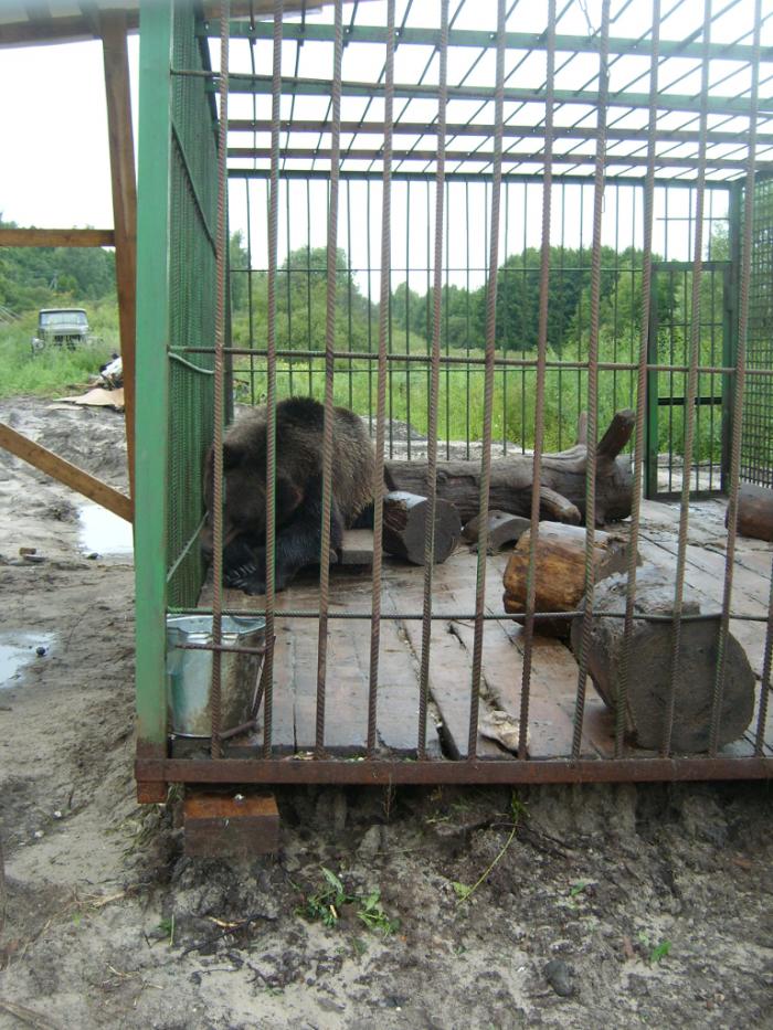 Спустившись вниз, подошли к озеру. Около берега кем-то из местных предпринимателей оборудуется что-то типа парка со скульптурами, беседками, и дикими зверями в вольерах. Из зверей видели лису и грязного, промокшего под дождем медведя. Рядом с медведем стоит ящик для пожертвований ему «на корм». Такое ощущение, что вольер медведя специально не накрыли от дождя, чтобы вид у него был более несчастный и соответственно более прибыльный.
