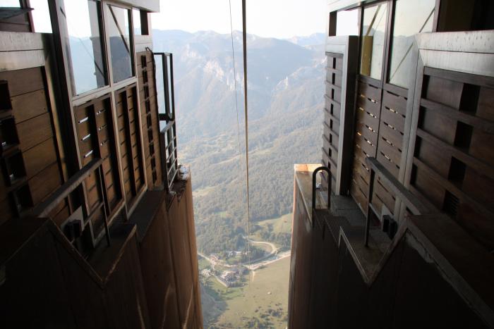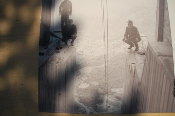 Fuente Dé начали строить в ноябре 1962 года. т.е. этому кадру исполнилось около 55 лет. Трое отчаянных парней, производящих монтаж данной конструкции, расхаживают по краю верхнего этажа без всякой страховки, совершенно игнорируя технику безопасности! Смельчаки, однако. Вот как выглядит то место сейчас.