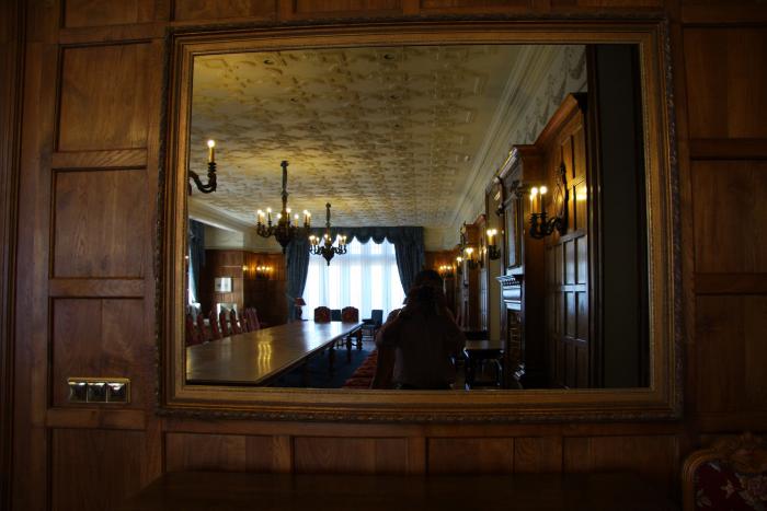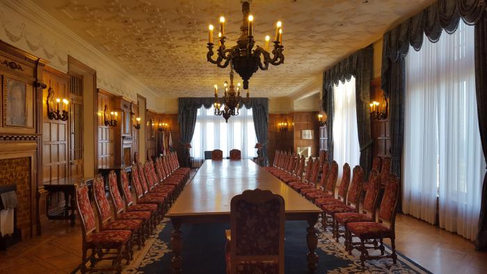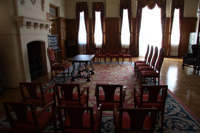 Но переместимся к главному залу — залу приёма дорогих гостей. Это помещение действительно является современной переговорной аудиторией, где происходят важные встречи и принимаются судьбоносные решения. За зеркалами есть комнатки для переводчиков и другого персонала.