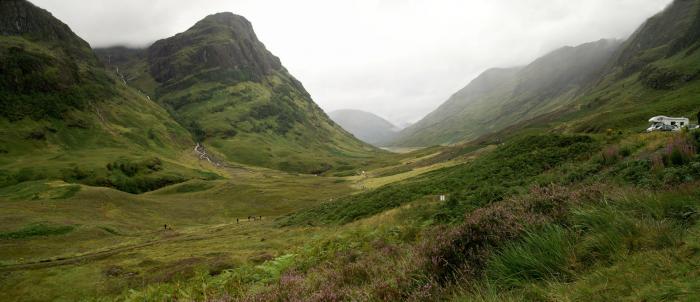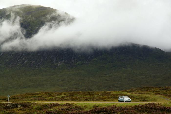 Безлюдные окрестности тянулись довольно долго, отдаленно напоминая Забайкалье, всё под стать погоде. Время — 3 часа пополудни, дождь прекратился, однако облачность сплошная и низкая — надежды на просветы нет. Перед ущельем Гленко (Glencoe) остановились полюбоваться вересковыми полями. Картина наяву и в объективе получается суровая — дикие, мрачные горы, неизбалованная солнцем растительность, о присутствии человека напоминает только ленточка асфальта — как будто мы за сутки переместились далеко на север. Откуда ни возьмись, налетела мошкара — облепляют все, что теплее окружающего воздуха. Пришлось, отмахиваясь, быстро прятаться в машину и “делать ноги”.