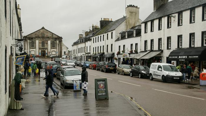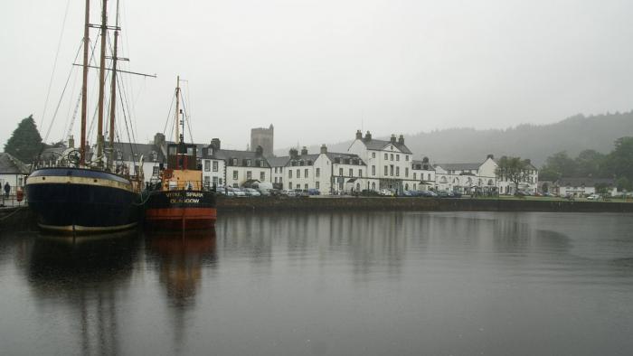 Этот шотландский приозерный городок запомнился нам туманным и тихим. Первым делом сунули нос в Inveraray Castle, но там была только большая комплексная программа задорого — не наш вариант. Значит просто идем в кафе (меню, кстати, уже шотландское, как и ассортимент сувениров в соседних магазинах). Парковочные знаки на Main Street гласили, что возможна стоянка не более 30 минут, поэтому сначала машина полчаса ждала нас возле кафе, а потом перебралась на платный паркинг рядом с пирсом.
