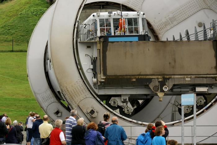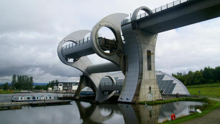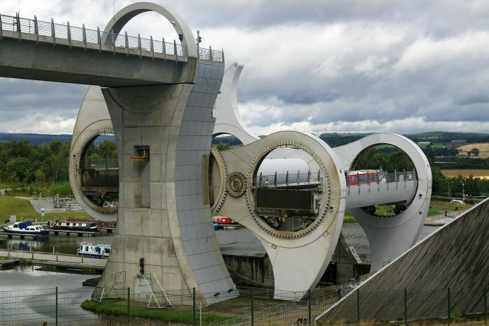 Вращающийся судоподъемник начал функционировать в 2002 году взамен цепочки шлюзов, соединявших Forth and Clyde Canal и Union Canal. Стоимость строительства 17.5 млн. фунтов стерлингов. Две уравновешенные гондолы вмещают по 360 кубометров воды. Перемещаемые суда не нарушают балансировки, т.к., в соответствии с законом Архимеда, лишняя вода вытесняется. Разница высот между нижним бассейном и каналом на акведуке — 24м. На один полуоборот колеса тратится 5.5 минут времени и 1.5 квт-ч электроэнергии. В информационном буклете эти цифры сравниваются с кипячением восьми домашних чайников.