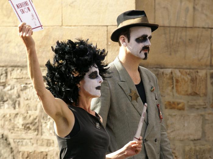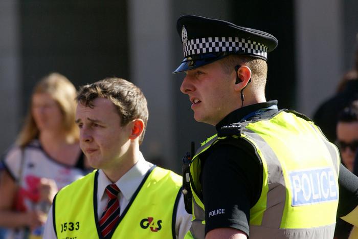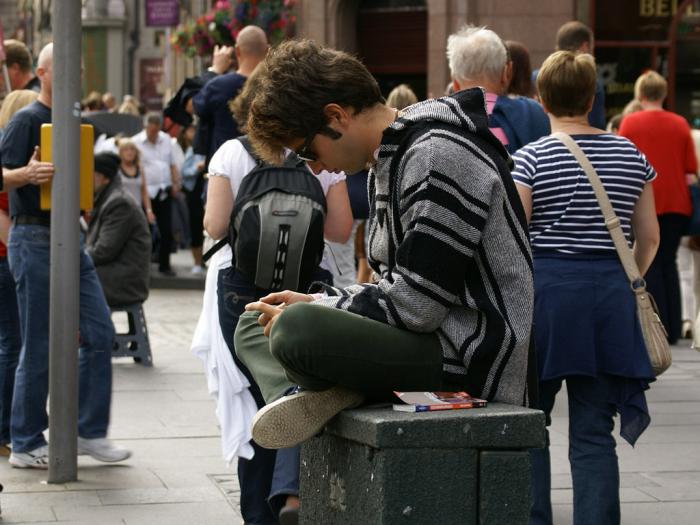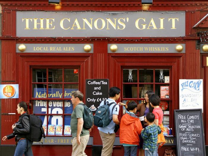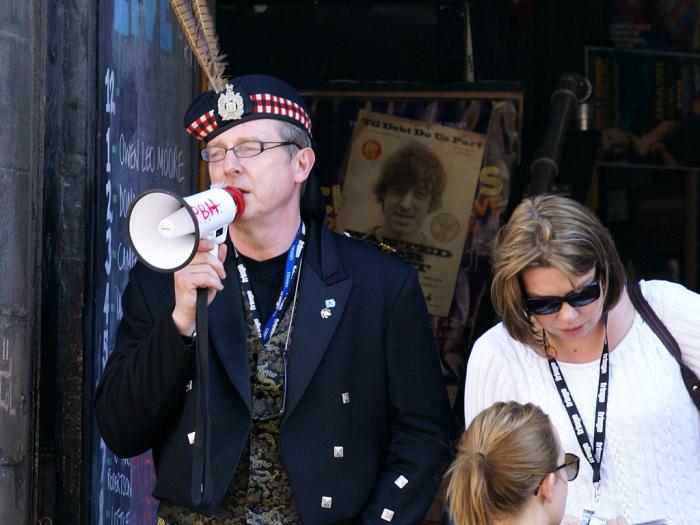 Выходим на «королевскую милю»... … в данный момент в районе традиционной High Street. Боковые улочки тоже привлекательны. На фестиваль кто только не приезжает. Приходите к нам! (уличные зазывалы) «Уши фотографа» А здесь, похоже, мы вышли на другой кусочек «мили» — Canongate. Чем ближе к замку, тем выше плотность потока. Всё чаще и чаще попадаются выступающие личности, собирающие толпы людей. При этом, некоторые зрители не менее интересны, чем артисты. Эта девушка не спит, она «оживет» в нужный момент. Вот этот парень шикарно импровизировал, целиком отдаваясь музыке. А этот исполнял классику, несмотря на дыры в инструменте. По моему, это турист в сувенирной обнове. Спешащих по делам горожан в килтах видели очень мало. Загадочное заведение. Порядок во время массовых мероприятий обеспечивают добровольцы... … и малочисленные полицейские патрули. На открытых пространствах, в местах скопления потенциально больших групп людей работают передвижные пункты видеонаблюдения. Запись ведется непрерывно и используется при необходимости во время разбора инцидентов.
