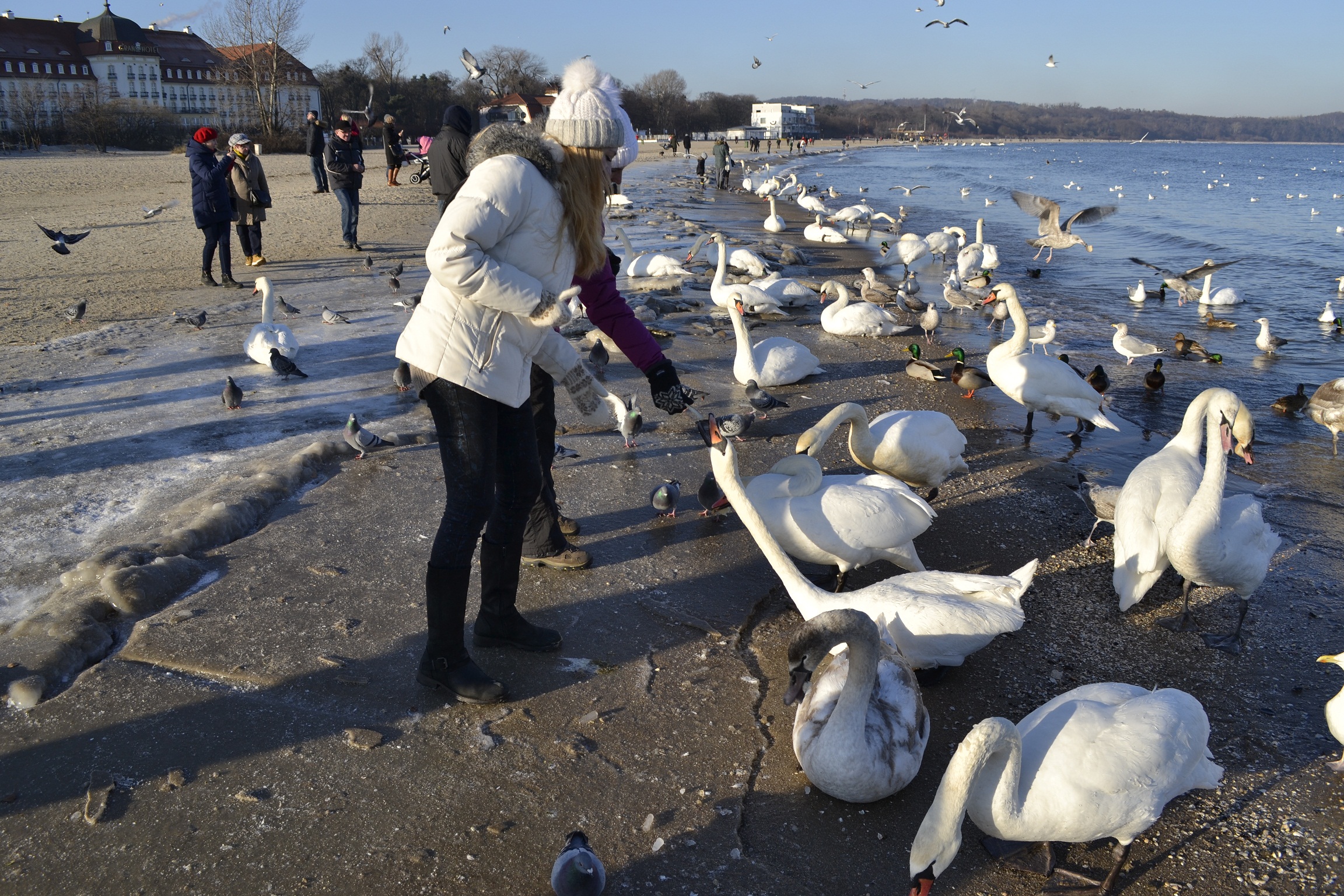 Покормили лебедей, коих там множество. Одна из этих прекрасных птиц цапнула дочку за палец. Потом кормили в перчатках, но у супруги лебедь стащил да же перчатку с руки. Так что обращаю внимание тех, кто будет кормить лебедей, очень осторожно, особенно если кормить хлебом будут дети, щипает/кусает больно!