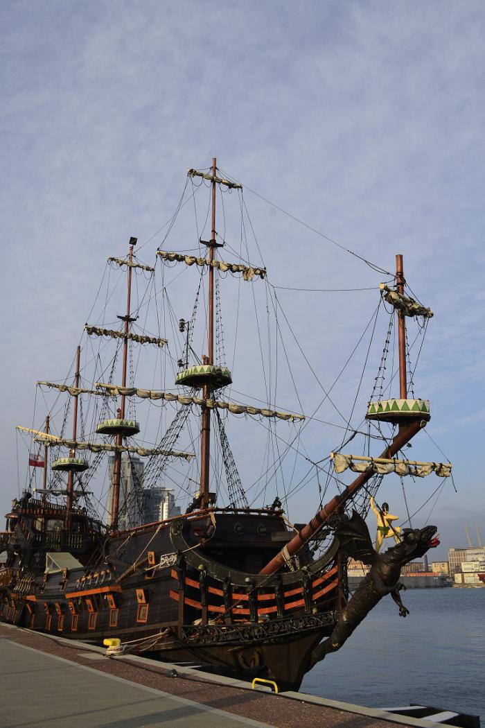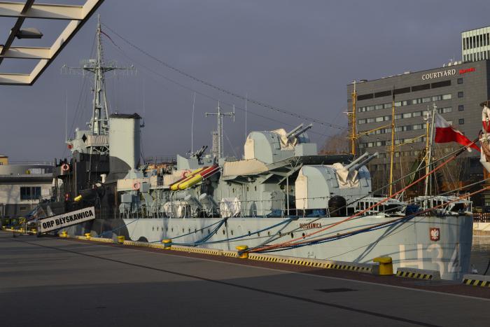 Итак, Гдыня. Мы заехали только посмотреть музей-корабль «Блыскавица». Но ничего не получилось, музей зимой не работает. Мы огорчились, просто посмотрели на корабль, прошлись по пирсу. Вообще ORP Blyskawica – это эсминец типа «Гром», который служил в ВМС Польши во время Второй мировой войны и является единственным кораблем, награжденным почетной медалью воинской доблести за выдающиеся боевые заслуги. «Блыскавица» — старейший сохранившийся эсминец в мире. Имя корабля в переводе на русский язык означает «Молния».